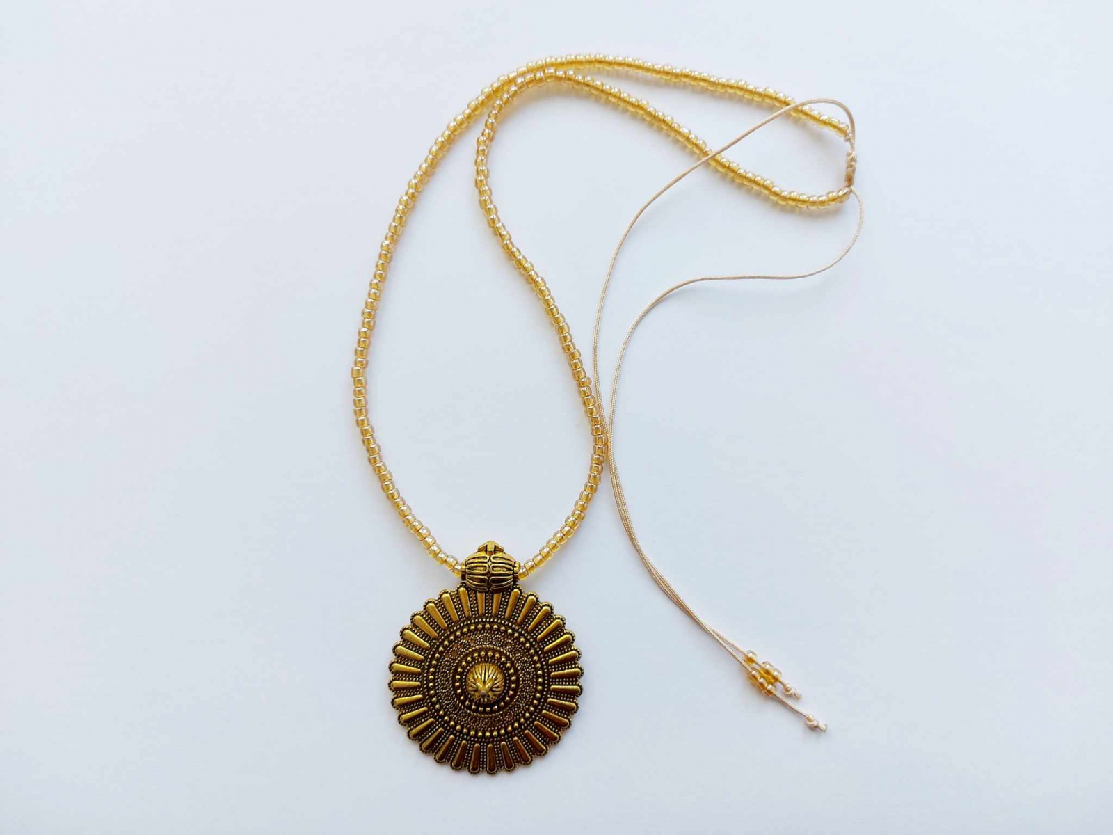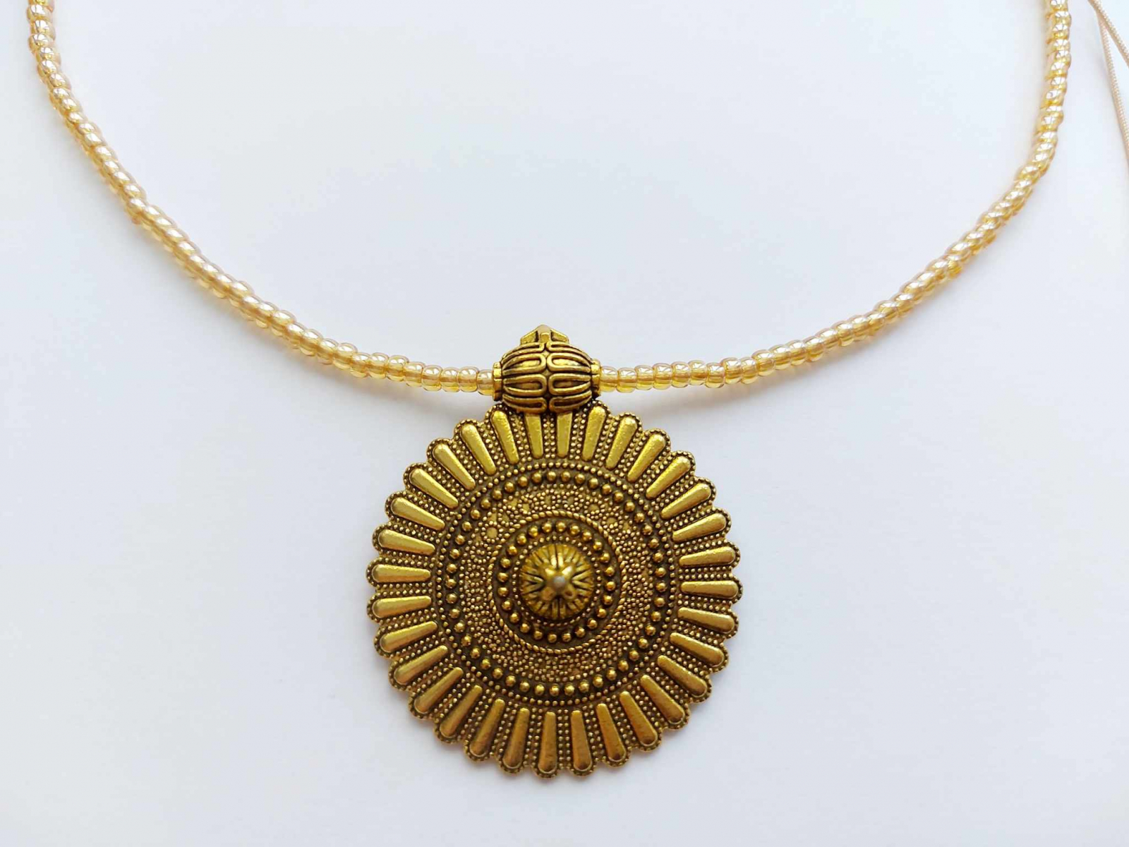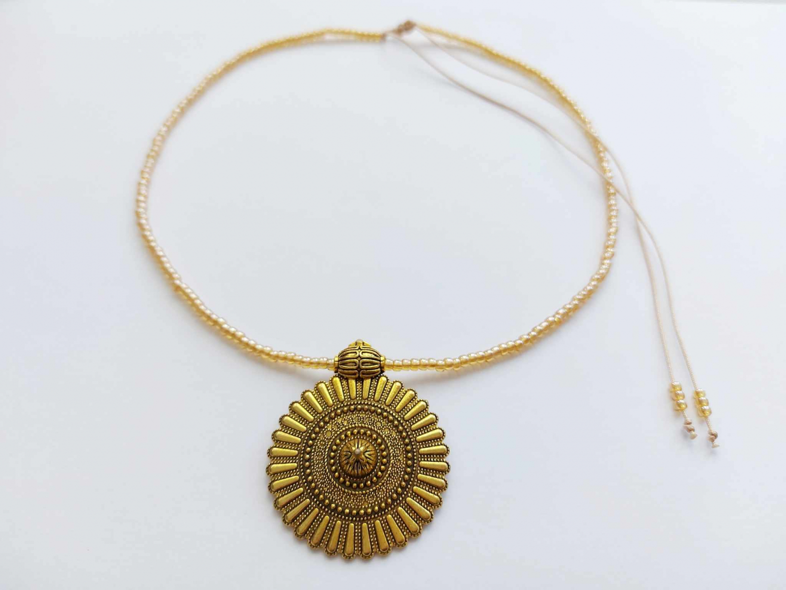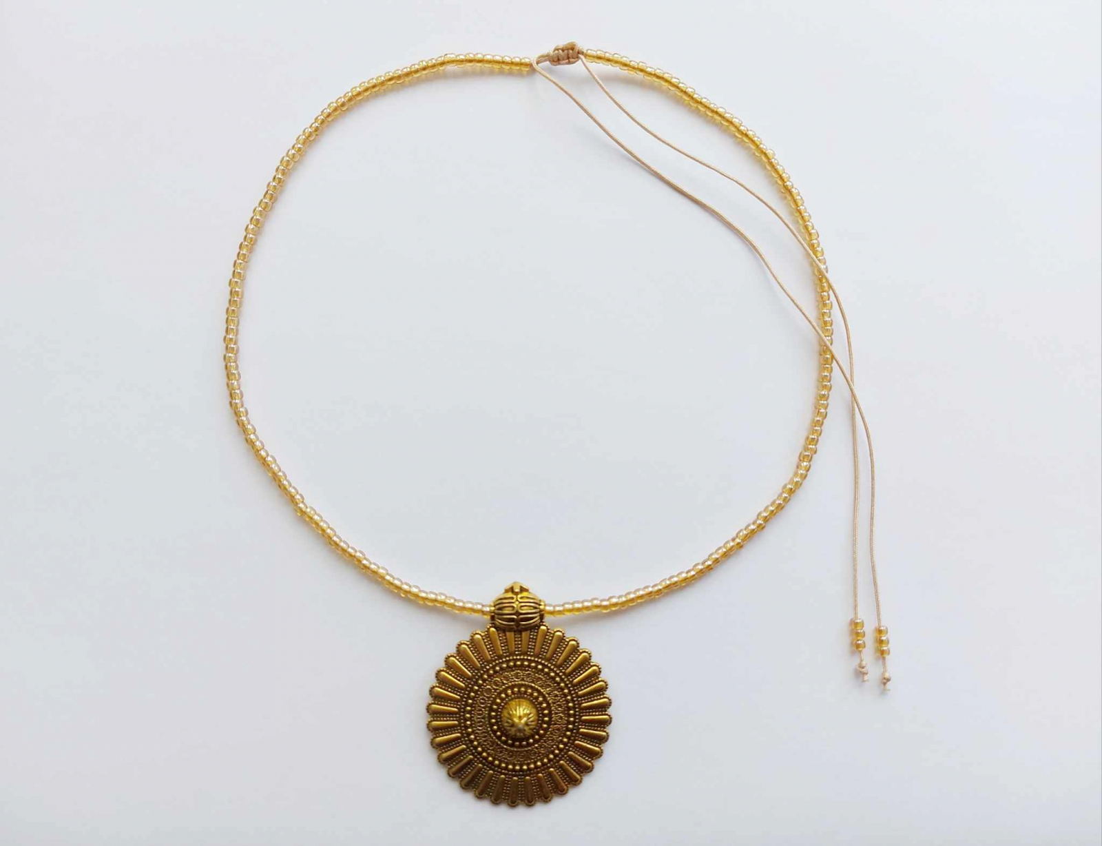 Colierul este creat pe șnur reglabil cu mărgele Toho de 4 mm și pandantiv auriu antichizat.