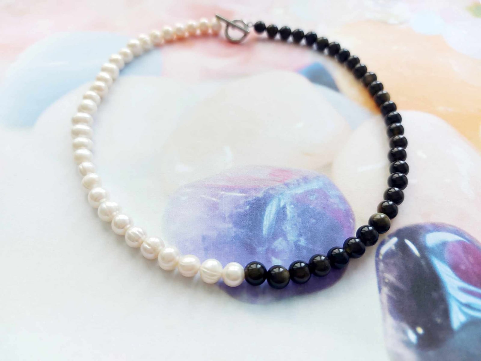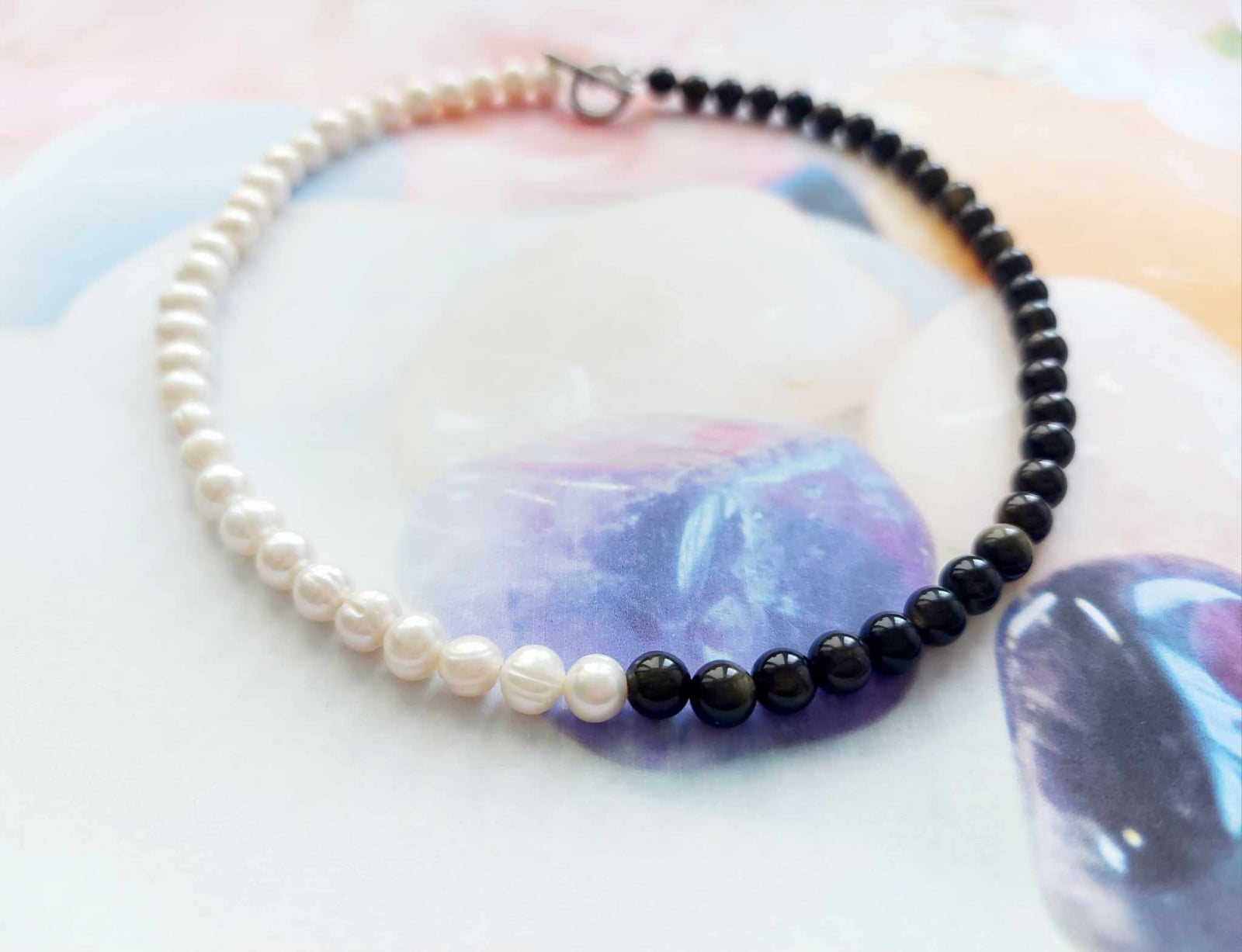 Acest colier handmade îmbină puterea misterioasă a Osbidianului cu rafinamentul și eleganța Perlelor de cultură. Designul său creează un contrast armonios potrivit atât pentru ținutele elegante, cât și pentru cele casual.