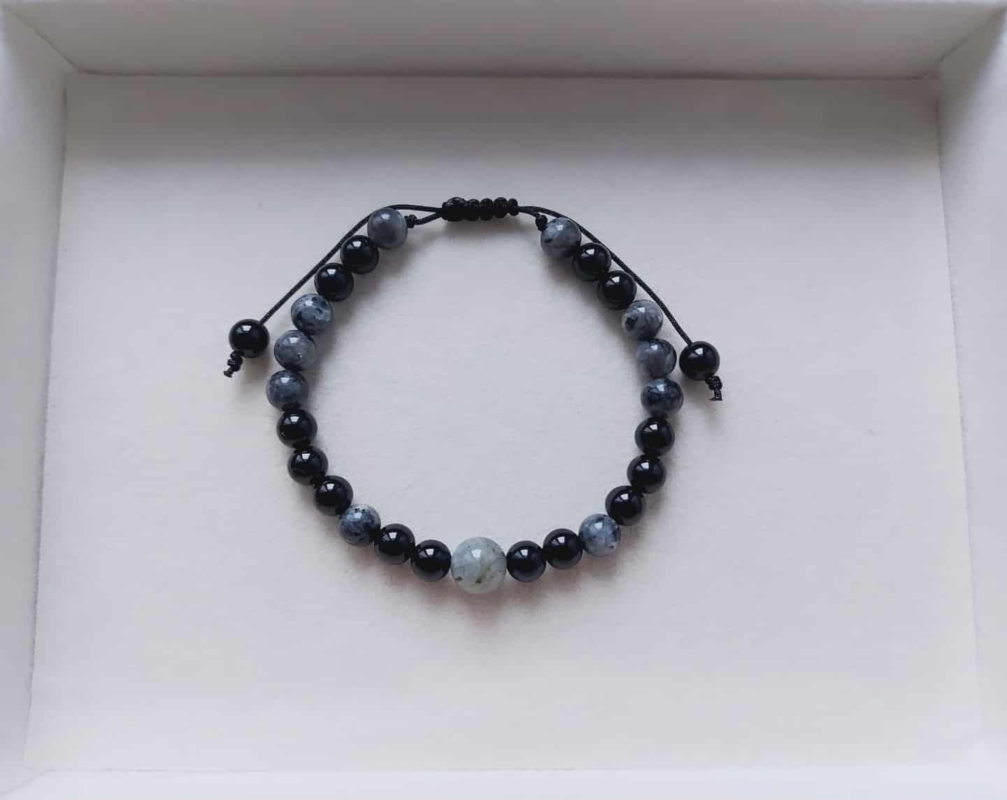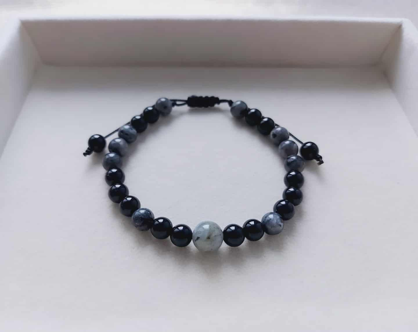 Brățară masculină modernă, simbol al încrederii, intuiției și protecției, realizată manual cu labradorit și onix pe șnur negru reglabil.