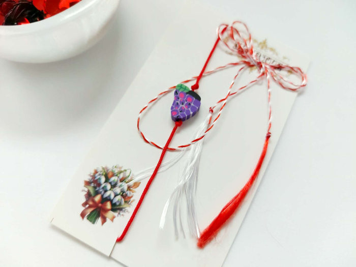 Brățară mărțișor cu șnur reglabil și charm în formă de mure.