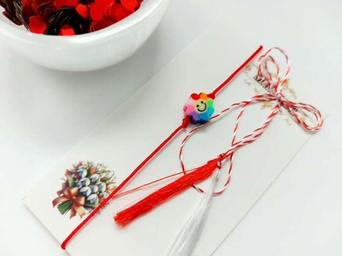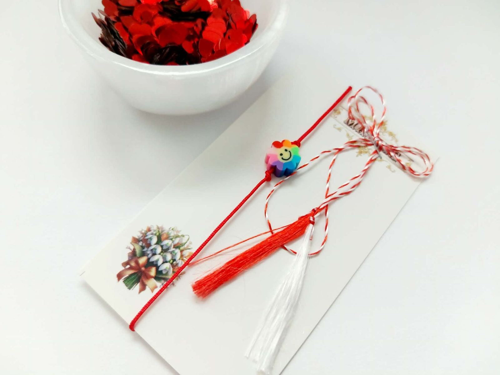Brățară mărțișor cu șnur reglabil și charm în formă de zâmbet, simbol al bucuriei și optimismului.