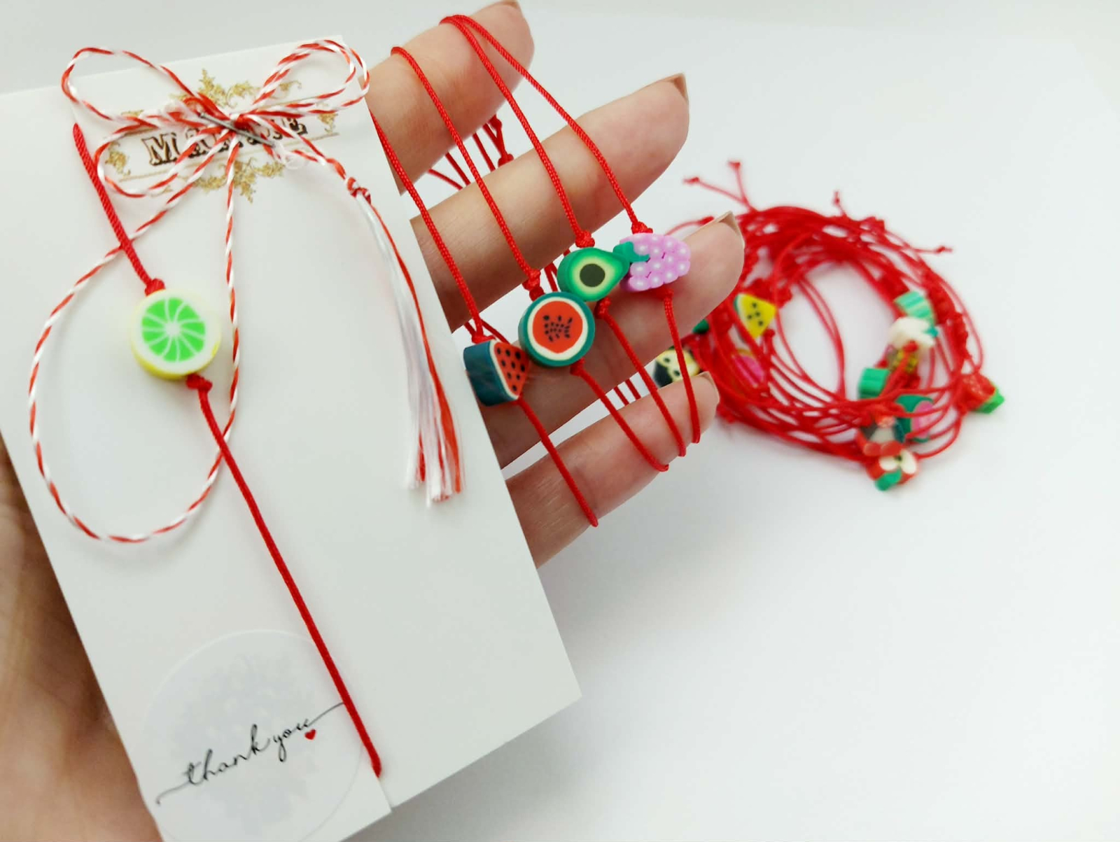 Brățară mărțișor cu șnur reglabil și charm în formă de fructe.